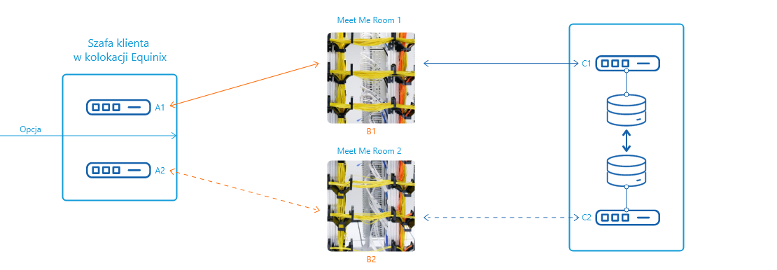 Dołączenie do systemu transakcyjnego dwoma niezależnymi dołączeniami w ramach jednego datacenter Klient zamawia dołączenie, dedykowany „cross-connect” na odcinku A-C